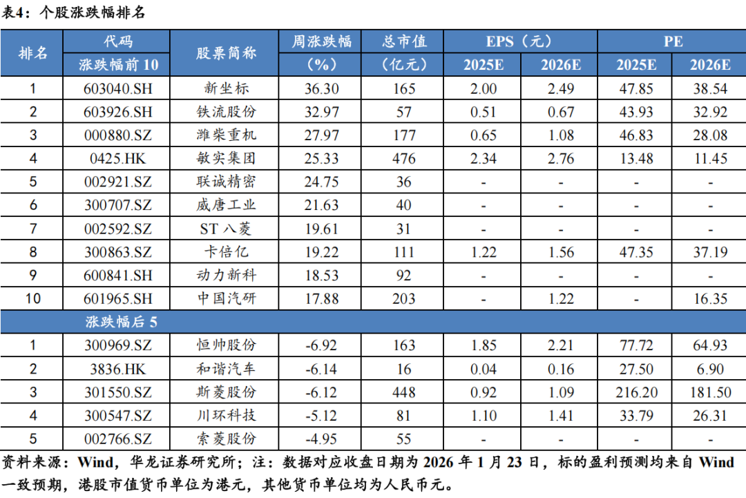 个股方面,本周231只个股上涨,59只个股下跌,涨跌幅前五的个股为新坐标(+36.30%),铁流股份(+32.97%),潍柴重机(+27.97%),敏实集团(+25.33%),联诚精密(+24.75%);涨跌幅后五的个股为恒帅股份(-6.92%),和谐汽车(-6.14%),斯菱股份(-6.12%),川环科技(-5.12%),索菱股份(-4.95%)。