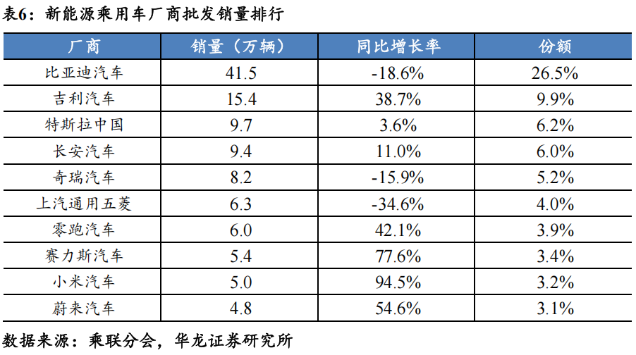 新能源销量前十位同比增速分化明显。分厂商来看,2025年12月,比亚迪汽车/吉利汽车/特斯拉中国分别以41.5/15.4/9.7万辆位居新能源乘用车厂商销量排名前三位。其中吉利汽车、零跑汽车、赛力斯汽车和小米汽车等在新车型的拉动作用下新能源销量同比高增。