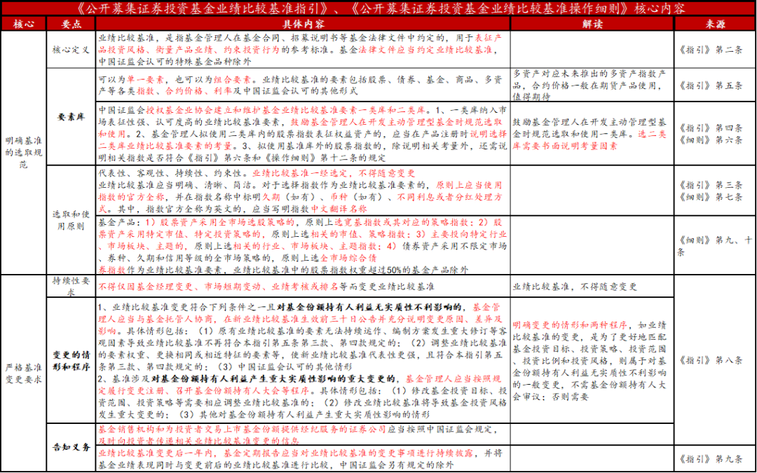 (一)明确基准的选取规范。一是代表性要求。基准的构成要素与权重应当能够表征基金产品投资风格,并符合基金合同约定。投资风格主要包括投资策略、投资方向、风险收益特征等。二是客观性要求。基准的计算方法、数据来源等应当清晰透明、可持续、可量化,标的资产可公允定价。三是指数的特别要求。选取的指数应当满足代表性强、编制方案合理、成份券具备较好流动性、持续披露信息等条件,且相关指数编制机构应当具备较强的研发和运维能力等。四是强化管理人、托管人责任。管理人应当按照合理化、差异化布局的原则开发产品,明晰产品定位和投资风格,确定匹配的基准和基金经理。托管人应当加强基金合同审核,对基准的选取、变更等进行充分评估。五是授权基金业协会建立基准要素库。管理人可以从基金行业业绩比较基准要素库中选取基准要素。