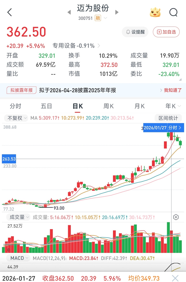 截至1月30日收盘,迈为股份股价跌至310.52元。三天之内总市值蒸发约150亿元,以867.6亿当前市值成为2026最快被打破的光伏千亿神话。