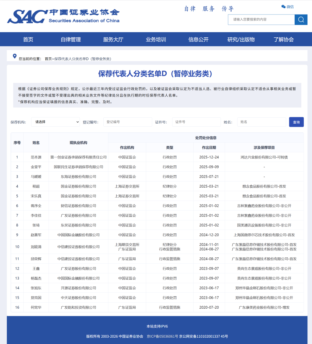 中国证券业协会(管券商的行业组织)最近更新了一份“黑名单”(D类名单),上面有 16位保荐代表人(简称“保代”)。上了这个名单,就意味着他们暂时失去了在项目文件上签字的资格,业务被按了暂停键。