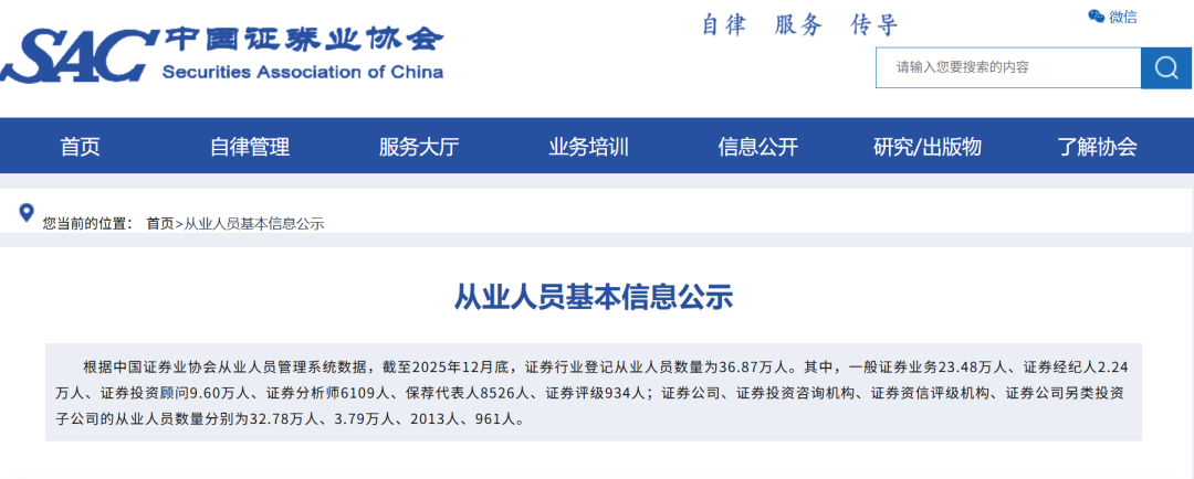 根据中国证券业协会从业人员管理系统数据,截至2025年12月底,证券行业登记从业人员数量为36.87万人。其中,一般证券业务23.48万人、证券经纪人2.24万人、证券投资顾问9.60万人、证券分析师6109人、保荐代表人8526人、证券评级934人;证券公司、证券投资咨询机构、证券资信评级机构、证券公司另类投资子公司的从业人员数量分别为32.78万人、3.79万人、2013人、961人。