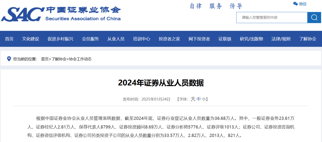 根据中国证券业协会从业人员管理系统数据,截至2024年底,证券行业登记从业人员数量为36.68万人。其中,一般证券业务23.61万人、证券经纪人2.81万人、保荐代表人8799人、证券投资顾问8.69万人、证券分析师5776人、证券评级1013人;证券公司、证券投资咨询机构、证券资信评级机构、证券公司另类投资子公司的从业人员数量分别为33.57万人、2.82万人、2013人、821人。