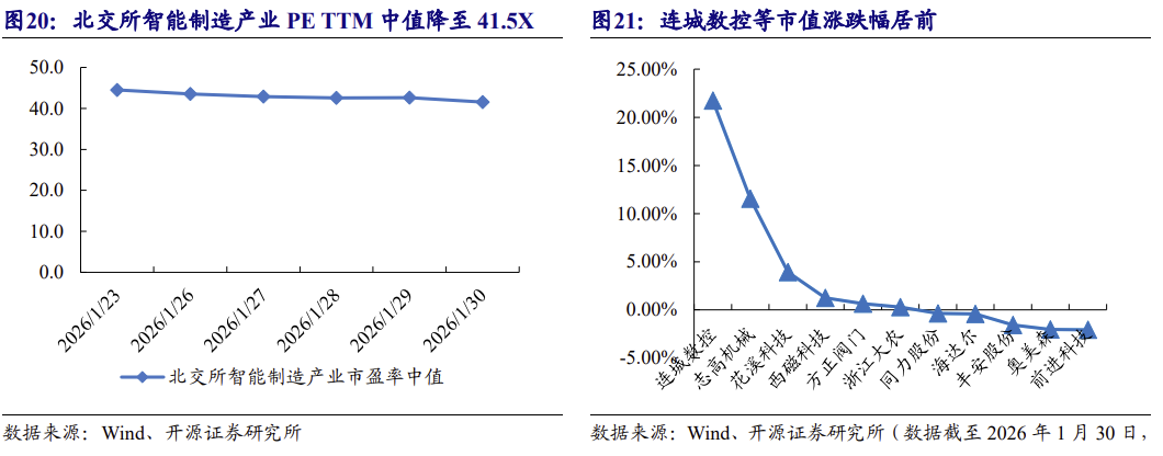 本周,从估值表现看,北交所智能制造产业市盈率 TTM 中值降至 41.5X。从本 周个股市值表现来看,连城数控+21.73%、志高机械+11.56%、花溪科技+3.92%分列 市值涨跌幅前三甲。(智能制造公司类别:包含机械设备、机械零件制造、军工制造、 交运设备、电气设备等细分行业)