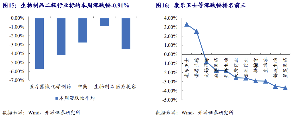 医药生物行业本周市盈率中值降至 29.5X,康乐卫士+3.31%、诺思兰德+2.55%、无锡晶海-0.79%涨跌幅排名前三。(医药生物包含医疗器械、化学制药、中药、生物 制品、医疗美容)