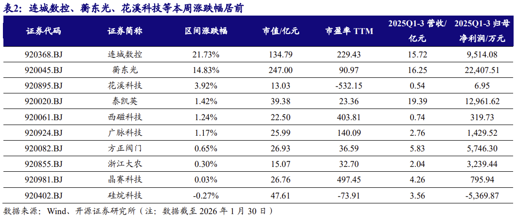 从周度涨跌幅数据来看,2026 年 1 月 26 日至 2026 年 1 月 30 日,北交所科技 新产业 159 家企业中 14 家上涨,区间涨跌幅中值为-6.53%,连城数控+21.73%,蘅 东光+14.83%,花溪科技+3.92%,泰凯英+1.42%,西磁科技+1.24%为涨跌幅前五 名标的。北证 50、沪深 300、科创 50、创业板指周度涨跌幅分别为-3.59%、+0.08%、 -2.85%、-0.09%。