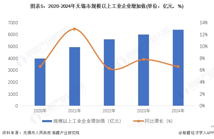 无锡市工业持续发展。2024年工业总量迈上新台阶,规模以上工业企业增加值达到6401.66亿元,比上年增长6.6%。