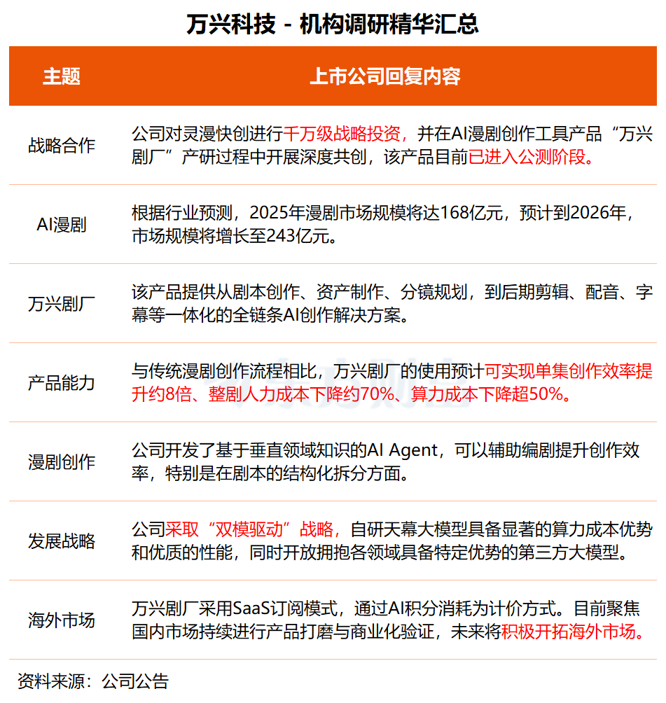 在调研中,万兴科技透露,公司对灵漫快创进行千万级战略投资,并在AI漫剧创作工具产品“万兴剧厂”产研过程中开展深度共创,该产品目前已进入公测阶段。“与传统漫剧创作流程相比,经内测,万兴剧厂的使用预计可实现单集创作效率提升约8倍、整剧人力成本下降约70%、算力成本下降超50%。”