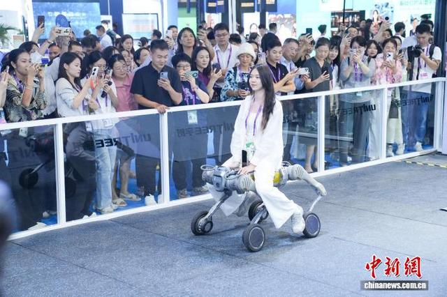 2025年9月17日,第22届中国—东盟博览会现场,展出的不少先进科技产品成为场上的焦点。图为工作人员乘坐一台机器狗巡游以展示其载重能力。 陈冠言 摄