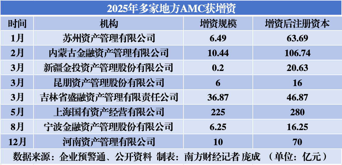 事实上,自2022年以来,地方资产管理公司(以下简称“地方AMC”)便持续掀起“增资潮”,注册资本“百亿俱乐部”成员稳步扩容。这一趋势背后,是监管层持续引导AMC积极参与各类风险化解工作,地方AMC在区域经济金融体系中的地位愈发凸显,而资本实力正是其发挥功能的核心支撑。