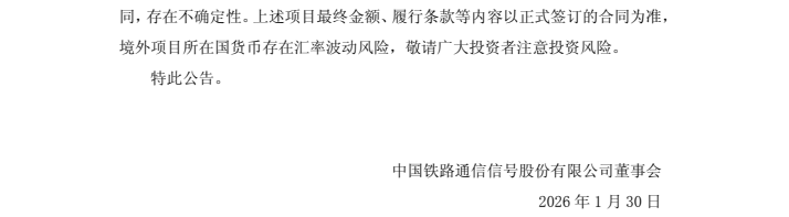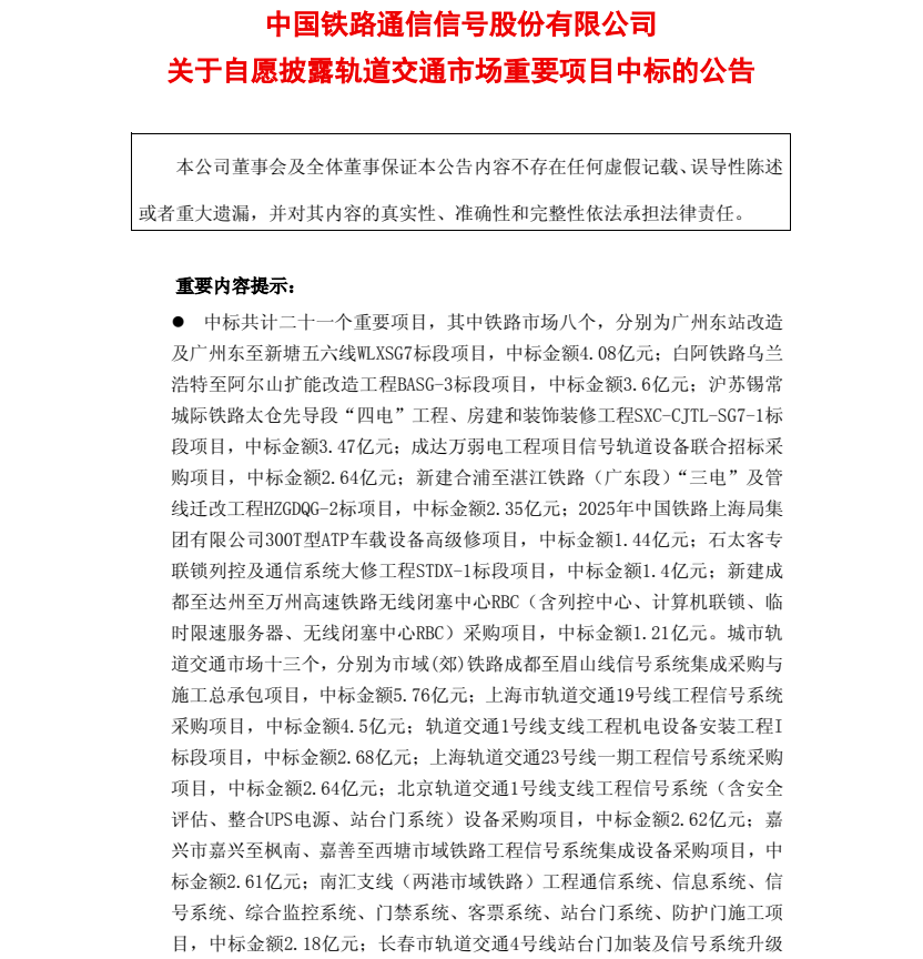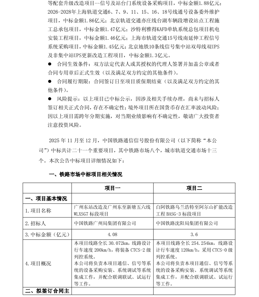 1月30日,中国通号发布公告称2025年11月至12月中标共计21个重要项目,其中铁路市场8个,城市轨道交通市场13个,中标金额总计约52.6亿元。