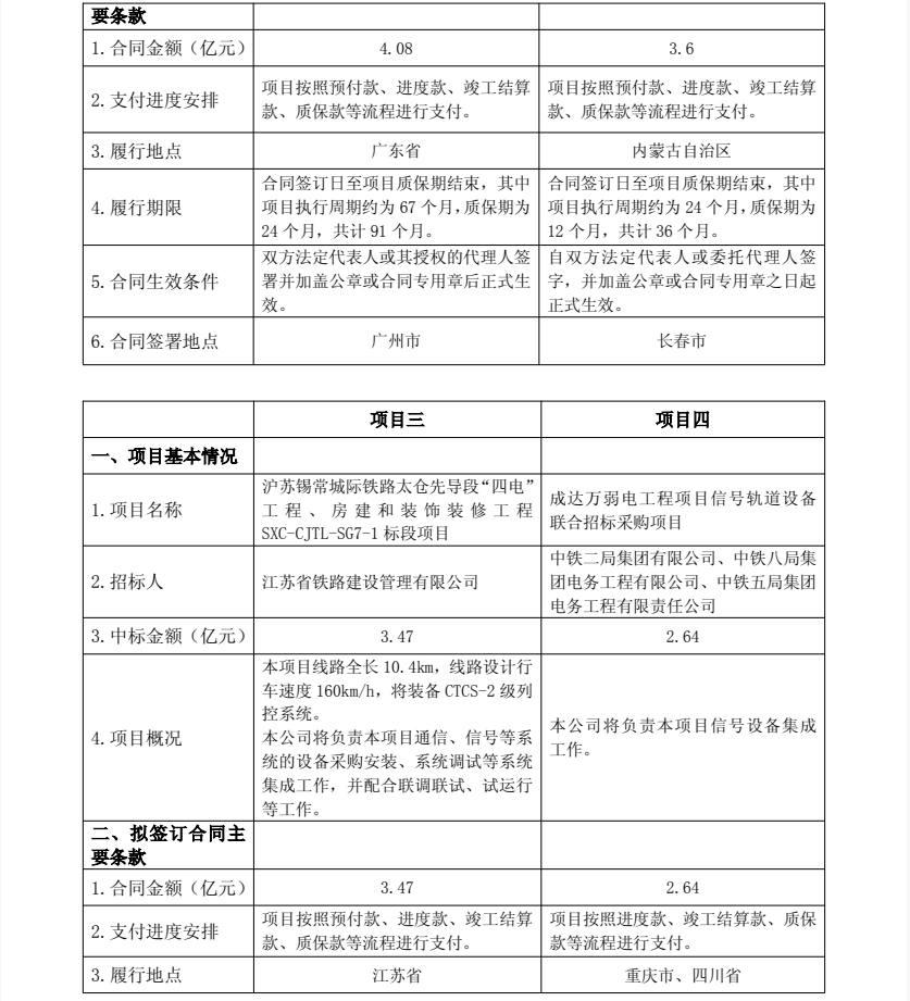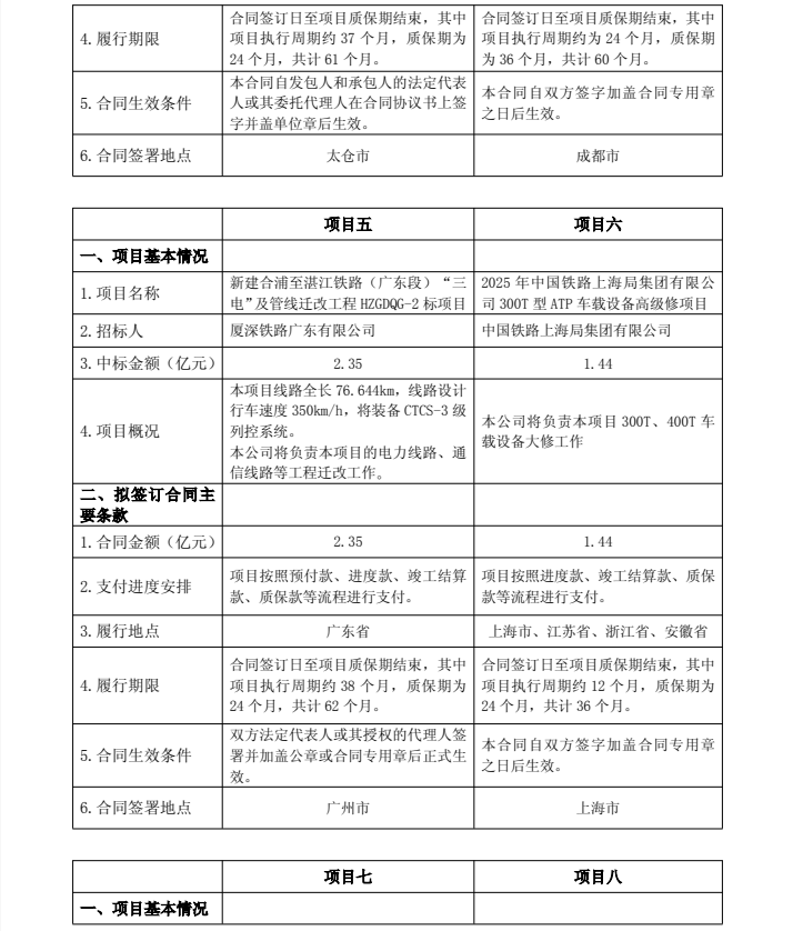 新建合浦至湛江铁路(广东段)"三电"及管线迁改工程HZGDQG-2标项目,中标金额2.35亿元;