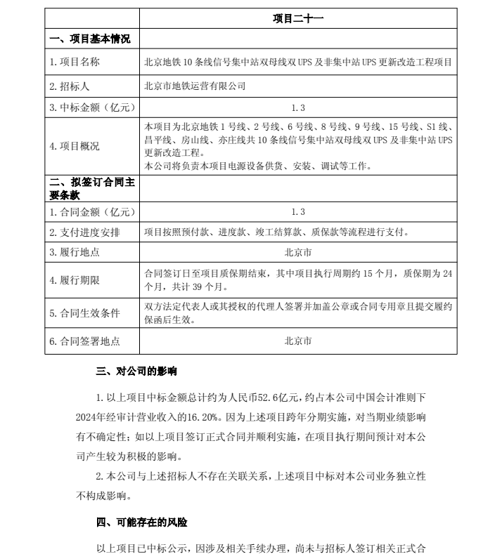 北京地铁10条线信号集中站双母线双UPS及非集中站UPS更新改造工程项目,中标金额1.3亿元。