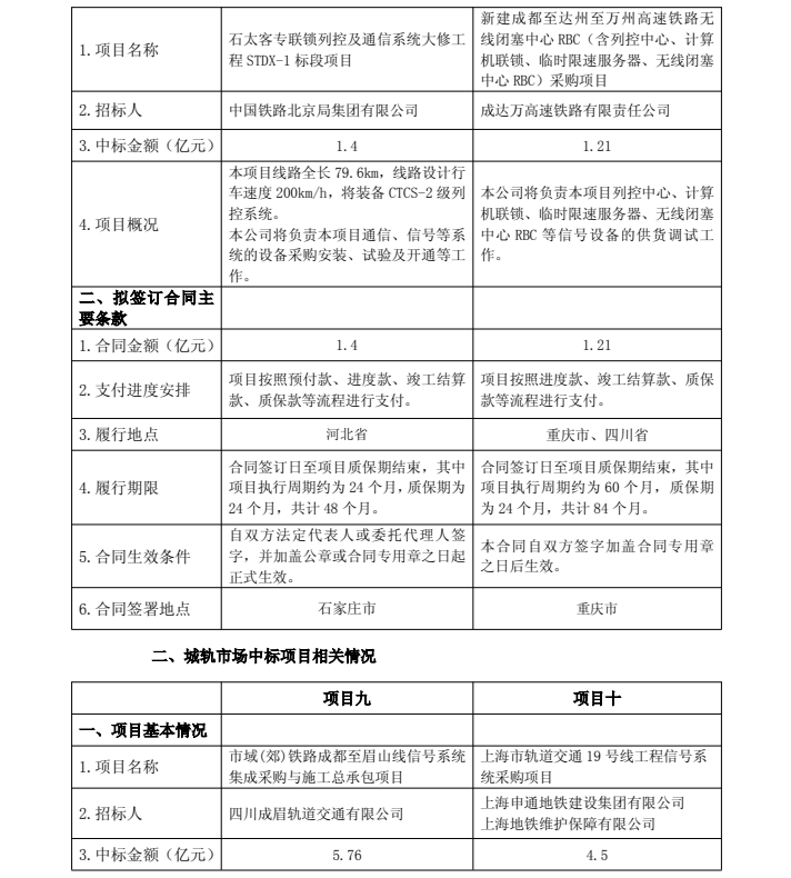 石太客专联锁列控及通信系统大修工程STDX-1标段项目,中标金额1.4亿元;