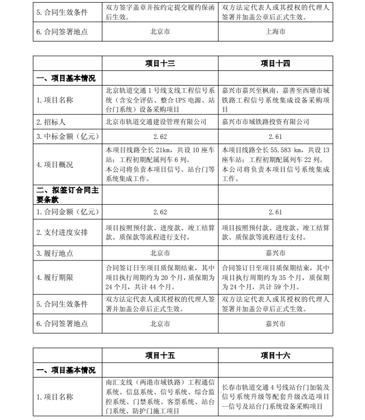 北京轨道交通1号线支线工程信号系统(含安全评估、整合UPS电源、站台门系统)设备采购项目,中标金额2.62亿元;