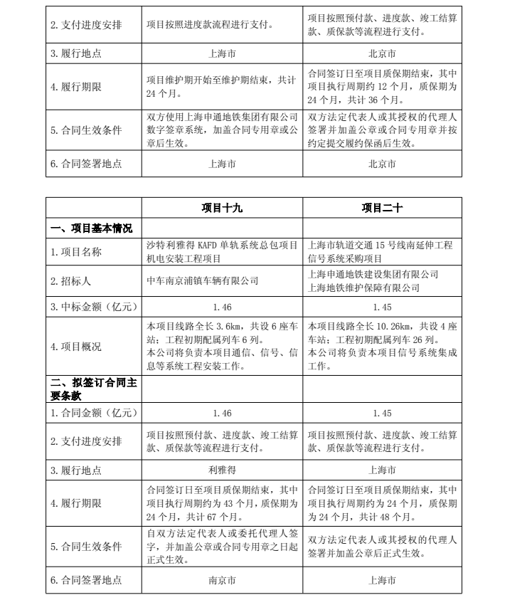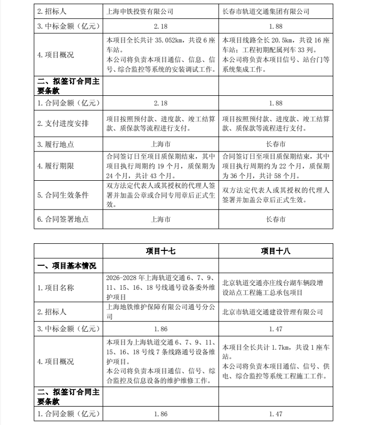 南汇支线(两港市域铁路)工程通信系统、信息系统、信号系统、综合监控系统、门禁系统、客票系统、站台门系统、防护门施工项目,中标金额2.18亿元;