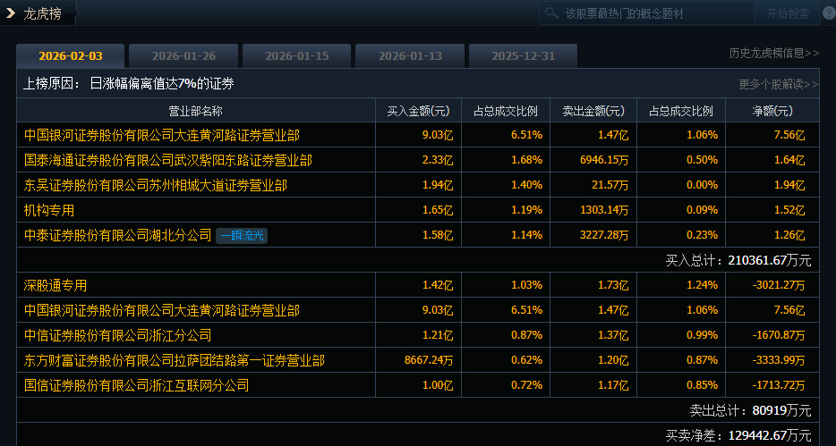 航天发展(000547)今日涨停,成交额138.72亿元,换手率28.12%,盘后龙虎榜数据显示,深股通专用席位买入1.42亿元并卖出1.73亿元,1家机构专用席位净买入1.52亿元。中国银河(601881)证券大连黄河路证券营业部净买入7.56亿元。