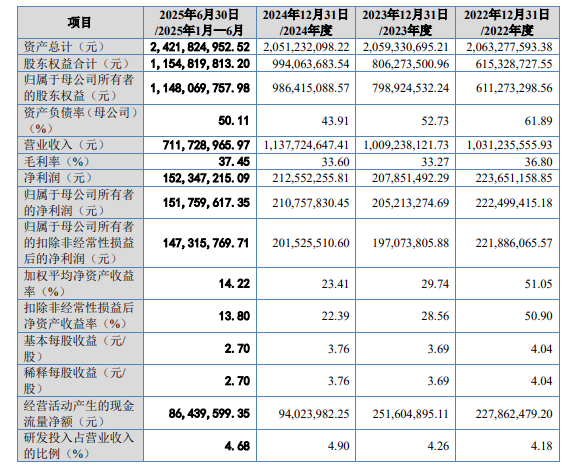 技术与产品的双重优势,也转化为公司稳步增长的经营业绩,成长潜力清晰可见。美德乐曾在招股书中披露2025年业绩预期,预计全年营业收入将达13亿-14亿元,同比增长14.26%-23.05%;归母净利润为2.7亿-3亿元,同比增幅28.11%-42.34%,营收与利润均有望实现双增长。回溯过往经营数据,该公司业绩同样保持稳健,2022-2025年上半年,美德乐营业收入分别为10.31亿元、10.09亿元、11.38亿元、7.12亿元;归属于母公司所有者的净利润分别为2.22亿元、2.05亿元、2.11亿元、1.52亿元;扣非归母净利润分别为2.22亿元、1.97亿元、2.02亿元、1.47亿元,在行业发展周期中保持了良好的盈利稳定性。