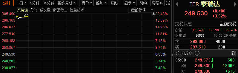 在此消息影响下,泰瑞达盘前股价暴涨20%左右,截至发稿,盘前涨幅达到22.43%。