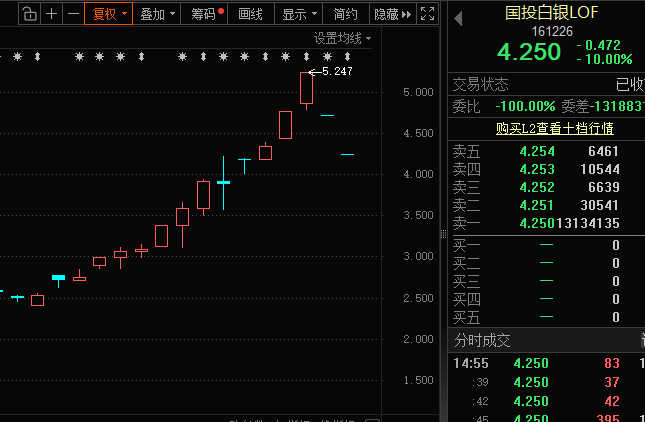 被市场爆炒的国投白银LOF(161226),继续巨量封单一字跌停,收盘封单仍超千万手,达1313万手。消息面上,2月2日晚间,该基金发布公告,当日单位净值跌幅高达31.5%。尽管如此,该基金的溢价率仍接近89%。