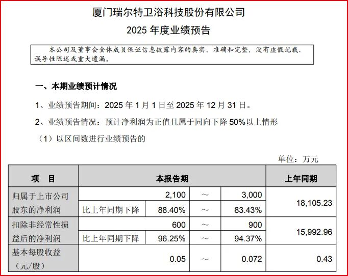 近日,又有十多家卫浴、家居、建材及家装企业发布2025年业绩预告,从预告来看,大部分企业归母净利润预计为亏损状态。其中卫浴类相关的企业中,瑞尔特预计归母净利润同比下降88.40%至83.43%;海鸥住工预计亏损9500万元至1.3亿元。