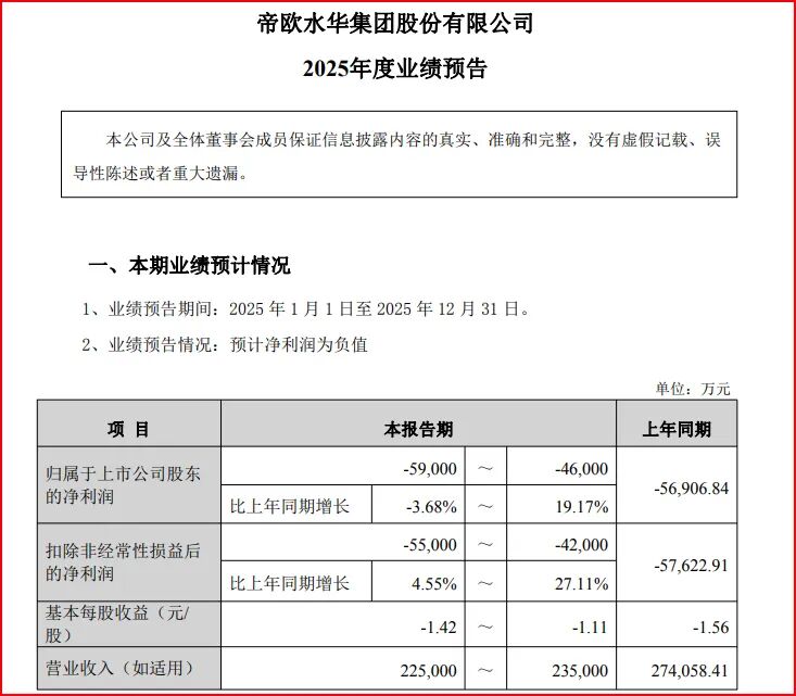 1月31日,帝欧水华发布2025业绩预告。据公告,预计2025年度营业收入为22.5亿元至23.5亿元,上年同期为27.41亿元;预计归属于上市公司股东的净利润比上年同期对比最高增长19.17%;扣除非经常性损益后的净利润比上年同期增长4.55%至27.11%。
