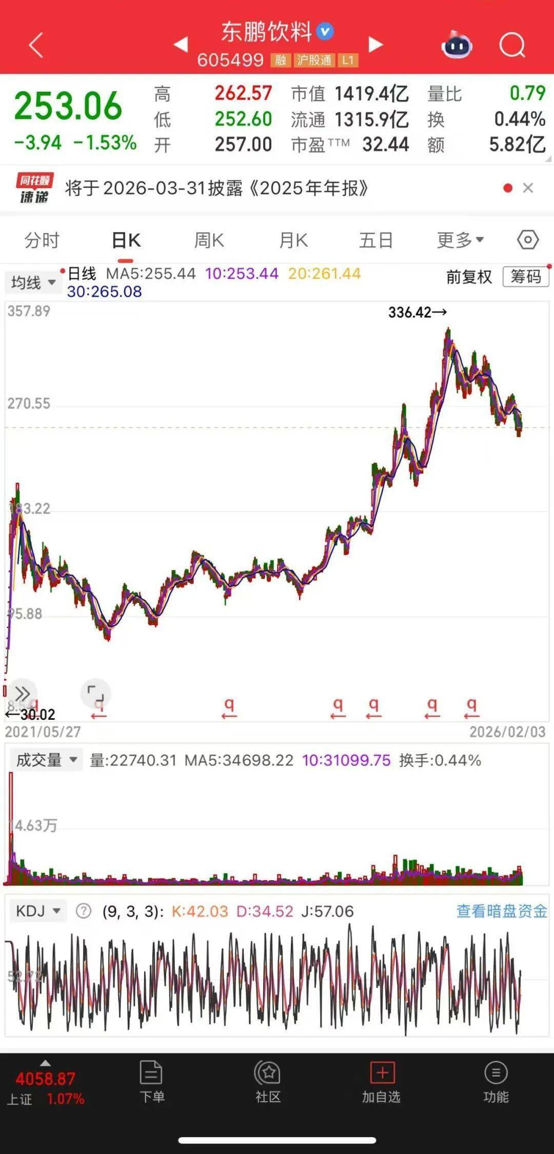 并且,前段时间股市涨那么猛,但东鹏的股价却一直在下跌,从336元/股跌到了250元/股。