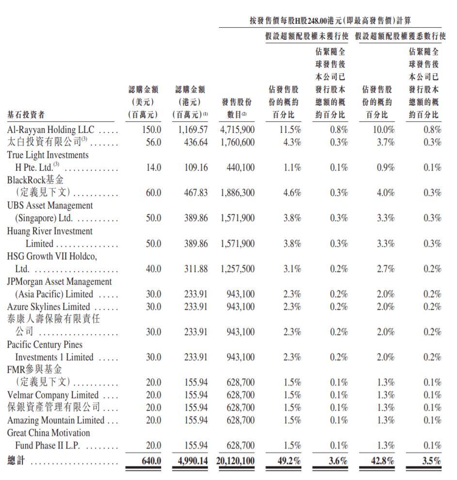 保银资管 、淡马锡 、李宁、 泰康人寿、卡塔尔投资局 、 瑞银 、 腾讯 、 红杉中国 、 李 嘉诚之子李泽楷等 引入15家基石投资者,累计认购金额约6亿4千万美元。