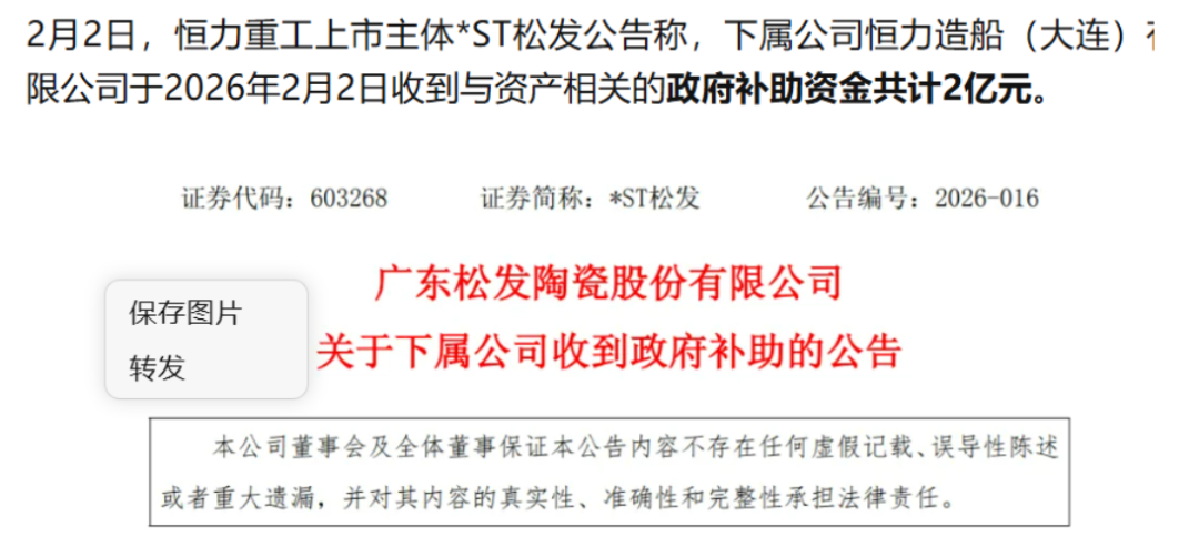 2月2日,恒力重工上市主体*ST松发公告称,下属公司恒力造船(大连)有限公司于2026年2月2日收到与资产相关的政府补助资金共计2亿元。这是恒力造船2026年披露的首笔政府补助,资金将主要用于船舶制造相关资产的升级改造、绿色智能造船技术研发及产能优化,为企业持续推进高端船舶建造、巩固行业地位提供有力的资金支撑。