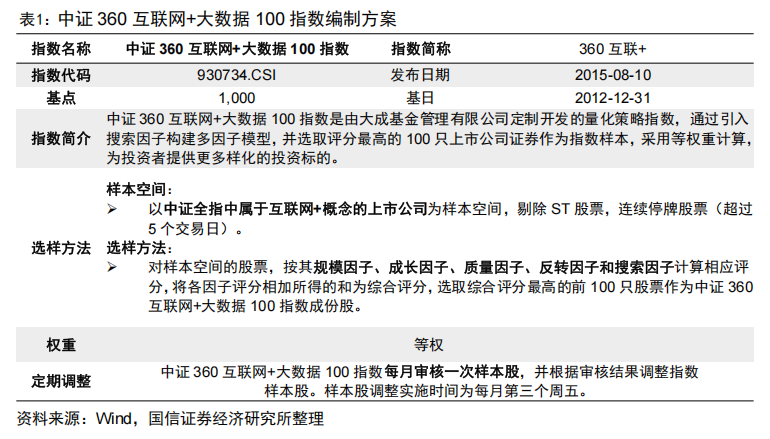 中证360互联网+大数据100指数以中证全指中的“互联网+”概念股为样本空间,将360搜索引擎上亿用户的查询频次转化为“搜索因子”,再结合规模、成长、质量、反转四大传统因子综合评分,最终筛选出100只优质标的。