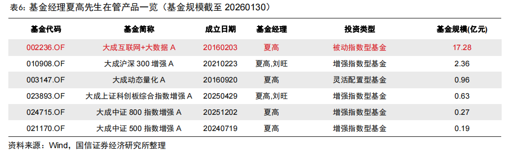 夏高先生当前在管产品共6只,包括一只被动指数型基金,一只灵活配置型基金和四只指数增强型基金,量化产品管理经验丰富,管理规模合计21.69亿元。