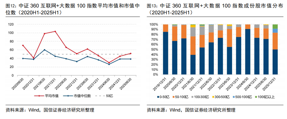截至2025H1,中证360互联网+大数据100指数的平均市值为51.66亿元,小于同期中证2000的51.82亿元。从指数成份股数量分布来看,2020年来,指数平均超过65%的成份分布在市值小于50亿的股票中,超过85%的成份分布在市值小于100亿的股票中。