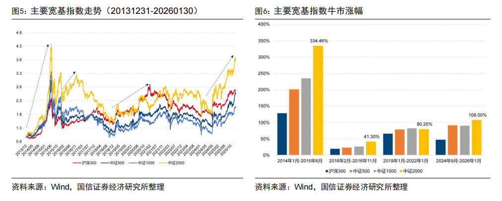 另一方面,小盘指数不仅在牛市中跑得更快,从长期视角看,自2014年以来其累计收益率始终位于主要宽基指数前列,显示出较强的跨周期超额收益能力。