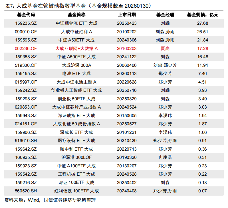 大成基金当前在管被动指数型基金规模合计151.86亿元。