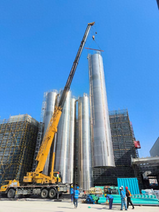 此次吊装作业单体高度大、就位精度要求高。为确保任务顺利完成,项目部精心策划,坚持“安全第一、方案先行”,多次组织现场勘测与方案推演,科学规划转运路线,周密部署机械与人员配置,为高效安全施工提供了可靠保障。吊装过程中,管理、施工、监理等各方紧密协同,全过程严格监控吊装姿态与环境变化,确保了6台料仓依次一次性精准就位。