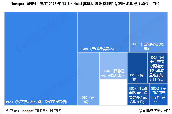 根据Incopat披露的数据显示,截至2025年12月,中国计算机网络设备制造专利重点关注H04L(数字信息的传输,例如电报通信)相关技术,共申请专利数量达到54874项;其次是H04W(无线通信网络),共申请专利数量16936项。
