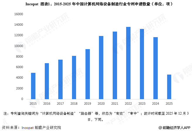 注:专利查询关键词为“计算机网络设备制造”“路由器”等,状态为“有效”“审中”;统计时间截至2025年12月3日,下同。