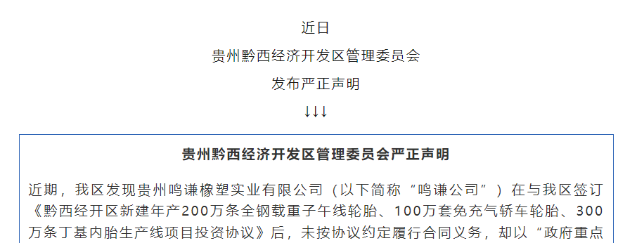 备受关注的百亿级轮胎投资项目近日突生变故。2026年1月30日,贵州黔西经济开发区管理委员会(以下简称“黔西经开区管委会”)发布重磅声明,宣布正式解除与贵州鸣谦橡塑实业有限公司(以下简称“鸣谦公司”)签订的投资协议。这一罕见的“公开退单”举动,不仅宣告了一个大型轮胎生产基地计划的流产,更揭开了企业在未履行投资承诺的情况下,冒用政府名义违规融资的真相。