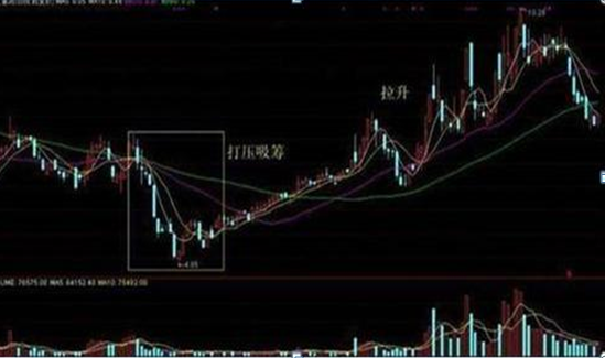 打压吸筹是最常见的庄家吸筹方法之一,也被股民形象地称为庄家“挖坑”吸筹。打压吸筹的手法常见于大盘下行的行情。此时市场信心受到打击,庄家借大盘下跌,在每日开盘便大笔卖出,导致个股大幅低开,再加上多日的连续打压,引起大批散户恐慌,割肉离场,庄家趁机低价吸入大量筹码。这种吸筹过程在k线上的表现出来就是多日阴跌。