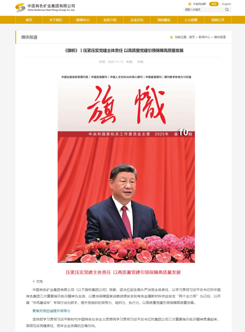 2025年,人民日报、新华社、中央广播电视总台等中央主要新闻单位聚焦中国有色集团,报道集团党建引领、经营提质、增储上产、科技赋能、改革提升、ESG实践、国际合作、先进典型等领域成果,获得广泛关注。