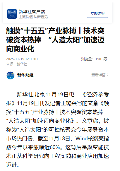 触摸“十五五”产业脉搏丨技术突破资本热捧 “人造太阳”加速迈向商业化