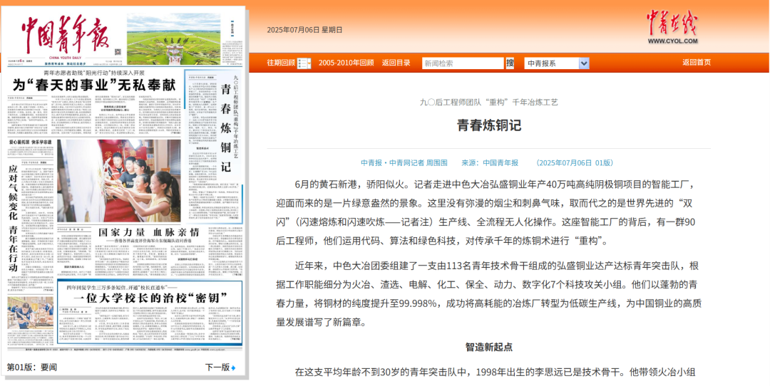 近年来,中色大冶团委组建了一支由113名青年技术骨干组成的弘盛铜业达产达标青年突击队,根据工作职能细分为火冶、渣选、电解、化工、保全、动力、数字化7个科技攻关小组。他们以蓬勃的青春力量,将铜材的纯度提升至99.998%,成功将高耗能的冶炼厂转型为低碳生产线,为中国铜业的高质量发展谱写了新篇章。