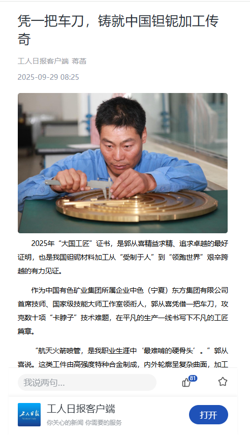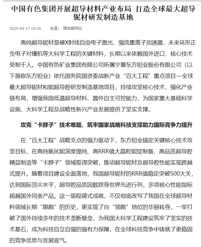 中国有色持续开展超导材料产业布局,打造了全球最大超导铌材研发制造基地,中国有色所属宁夏东方钽业股份有限公司(简称:东方钽业)持续深耕超导铌材制备技术,突破高纯度铌锭提纯、超导级铌加工材精密成型等“卡脖子”环节,建成国际领先的超导材料产业化基地。