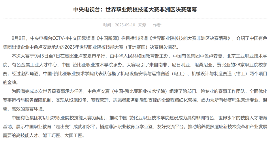 中央电视台CCTV-4中文国际频道《中国新闻》栏目播出报道《世界职业院校技能大赛非洲区决赛落幕》,介绍了中国有色集团出资企业中色卢安夏承办的2025年世界职业院校技能大赛(非洲赛区)决赛相关情况。