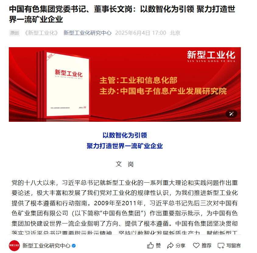中国有色集团党委书记、董事长文岗:以数智化为引领 聚力打造世界一流矿业企业