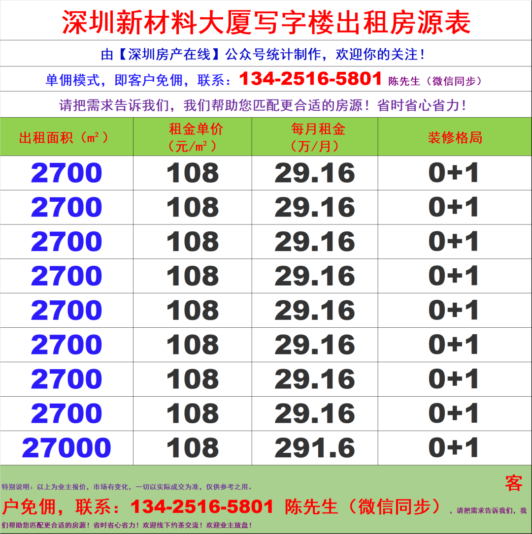 二、罗湖新材料大厦写字楼办公室出租房源表