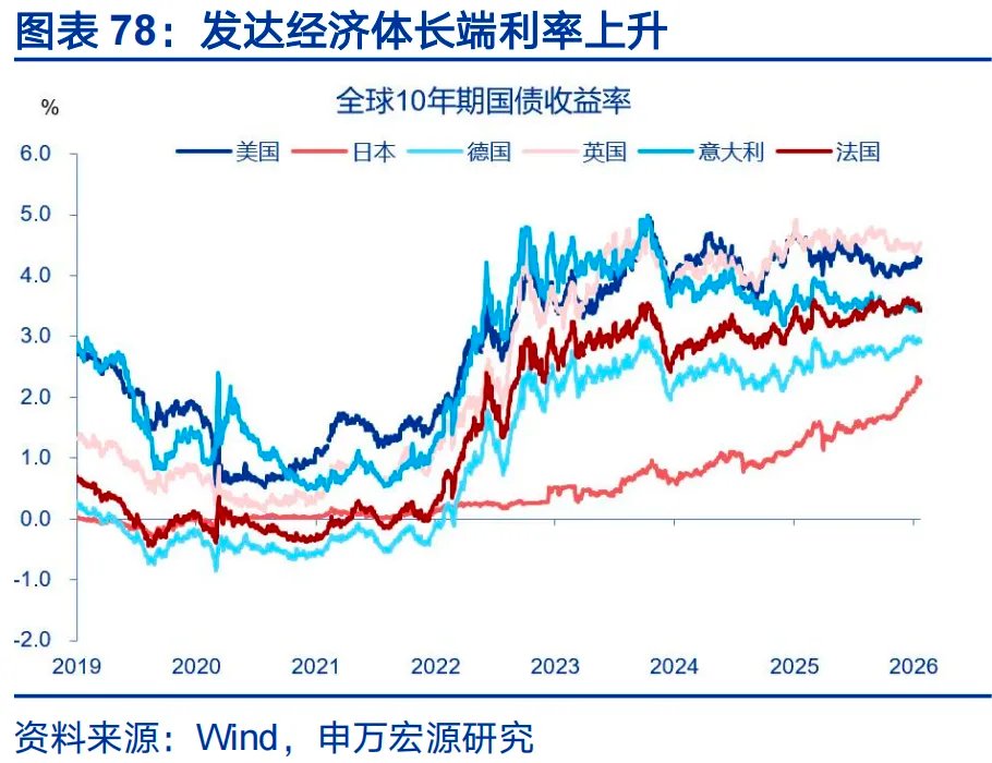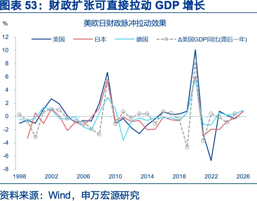 力度上,最突出的变化是,美欧日财政在非衰退情形下同步加码。这标志着财政目标的转变,从防衰退转向安全目标、产业竞争。2026日本赤字率或扩大0.8个点至3.2%,美国扩大0.8个点至6.8%、德国扩大0.9个点至4.0%,欧元区上升0.1个点至3.3%,美欧日财政脉冲高于一般年份。