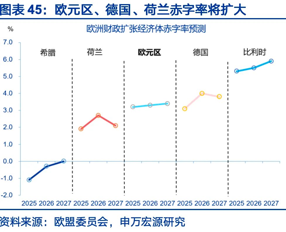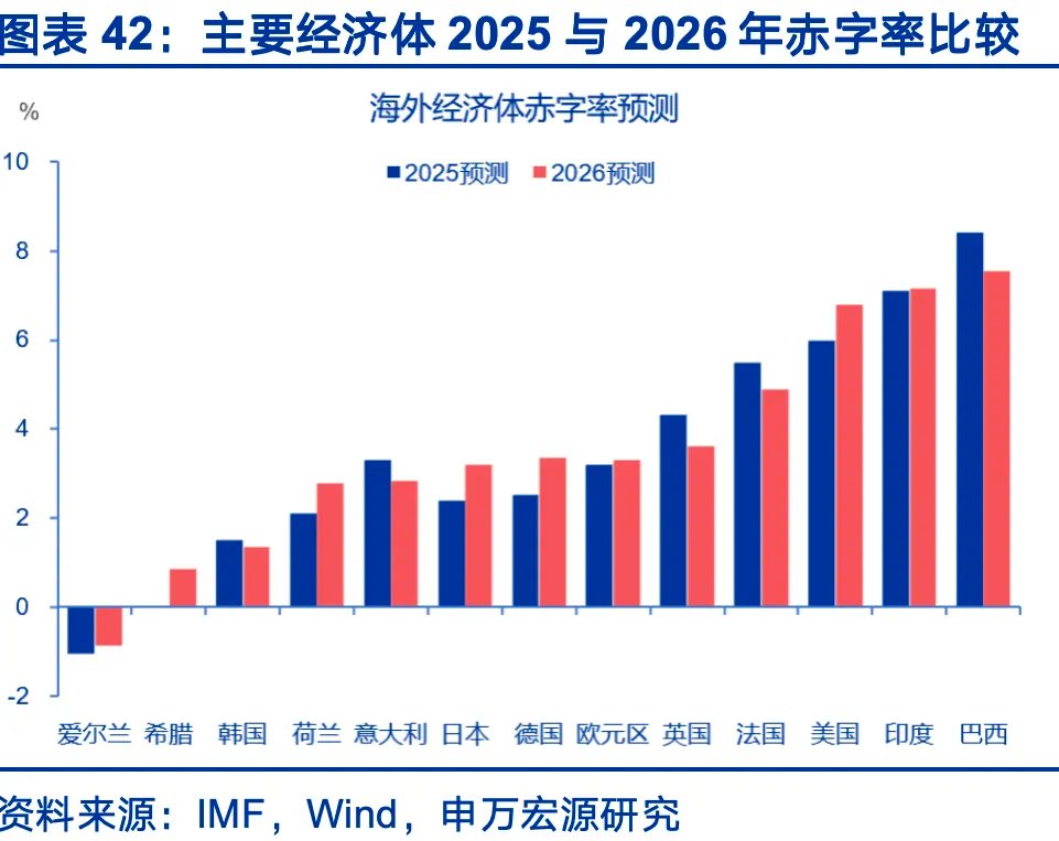 2026年海外财政顺周期扩张,力度高于一般非衰退年份,美日领跑财政扩张,欧洲内部分化较大,主要增量在德国。2026年,日本赤字率扩大0.8个点至3.2%,美国赤字率扩大0.8个点至6.8%,欧元区总体赤字率仅小幅上升约0.1个点至3.3%,其中荷兰扩大0.8个点至2.7%,德国预计扩大0.9个点至4.0%,在欧洲内部属于财政扩张幅度靠前的经济体。法国、意大利进入财政整顿程序,法国2026年赤字率预计下降0.6个点至4.9%,意大利预计下降0.2个点至2.8%。