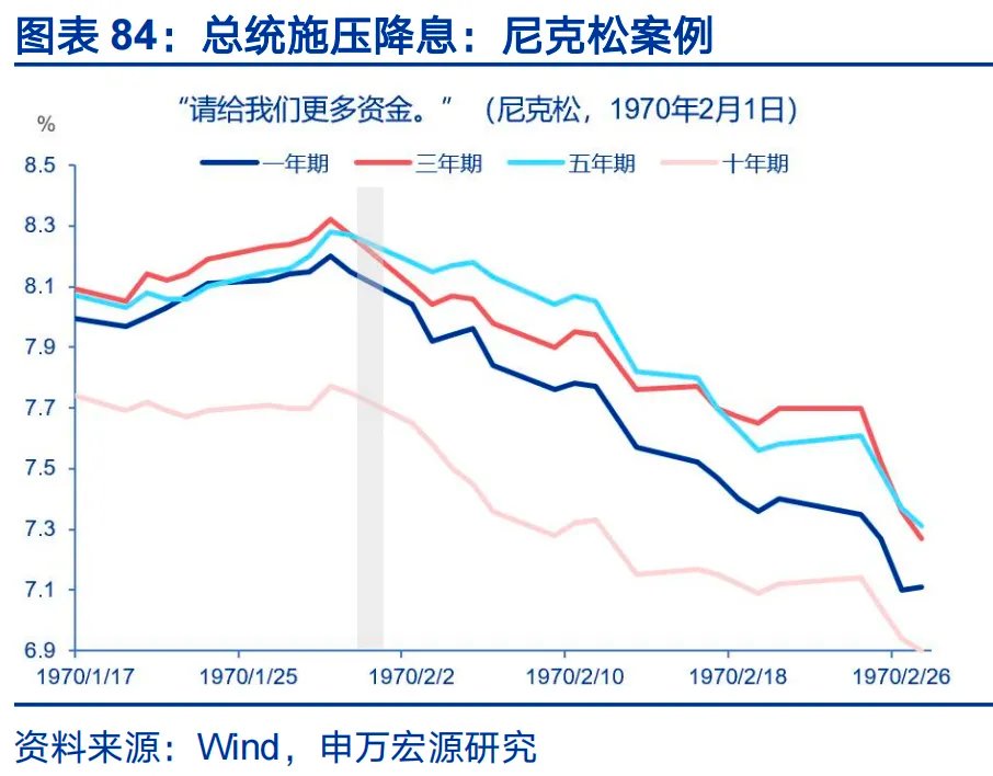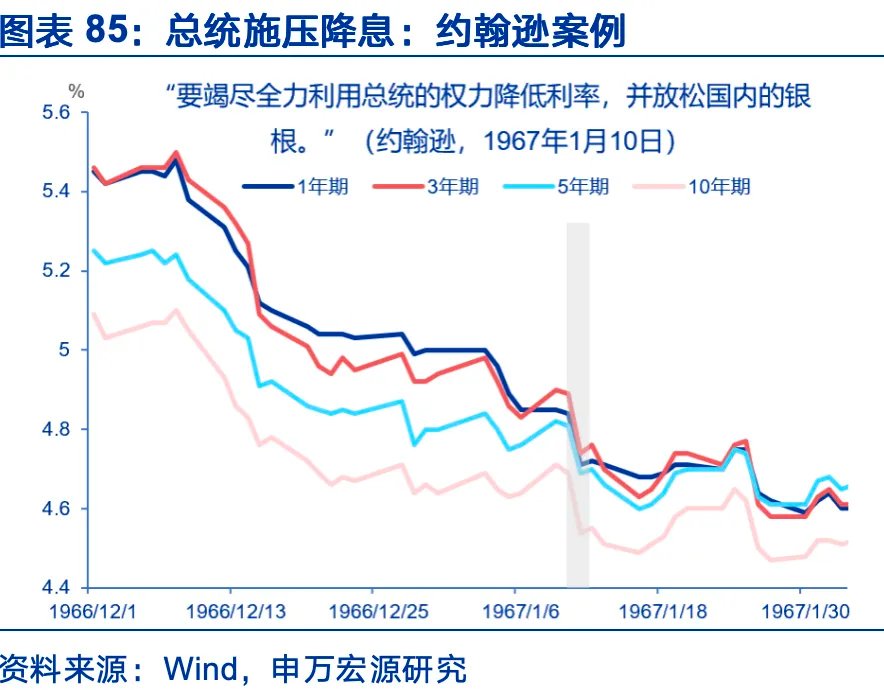 债务风险的变化或要求化债方式转变。以美国为代表的发达经济体,传统化债手段包括:财政整顿、金融抑制、通胀化债。首先,财政整顿在现有地缘、政治环境下或难以实现。财政紧缩是主权债务危机导致经济衰退的主要机制之一,在债务危机下,政府被迫紧缩,现金流切断,冲击实体经济,如2010年希腊债务危机,2013年美国的政府关门冲击等。2025年以来的债务风险主要体现为利率上冲,违约压力不足以迫使各国政府收紧财政,产业竞争、地缘压力迫使财政紧缩可行性下降。其次,金融抑制及通胀化债或不具备实施的条件,二者有其适用的经济环境:压倒性政治目标(战争),受限的资本流动,可控的国内金融体系,受限的替代投资渠道。金融抑制及通胀化债一体两面,通常配套实施,前者压低名义利率,后者稀释债务实际价值,共同构成负实际利率。若特朗普强行压低利率,可能削弱央行政策信誉,通胀预期或失锚,触发市场无序利率上行。参考BIS研究,财政主导体制下,赤字率每增加1个百分点,未来两年的平均通胀率上升约0.5%。货币主导体制下,赤字率增加1个点,仅导致通胀上升约0.1%。但不意味着特朗普不会挑战美联储独立性,从历史上尼克松及约翰逊的案例看,在不触发市场反噬的情形下,总统施压有助于压降政策利率预期与中长端收益率。但若突破市场预期,或导致相反效果。