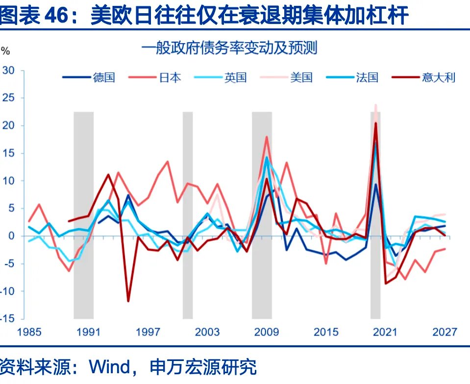 2025年,美欧日财政政策同步从逆周期转向“跨周期”。一是财政目标函数大幅扩围,从传统的需求侧管理扩大到供给侧重塑,国防安全、产业扶持等支出成为必选项,债务扩张更加刚性化;二是财政从被动熨平周期,转向主动引导周期,具有更强的积极性,扩张不再以衰退为触发条件。